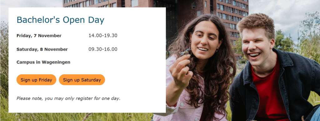 The Bachelor’s Open Days at WUR is are on-campus visit days open to visitors and interested individuals. It is aimed at prospective bachelor’s students who are interested in studying at WUR. The Open Days allow you to explore WUR’s programmes, campus, student life, and ask questions. It’s a great way to decide if the study environment and programme are a good match for you.